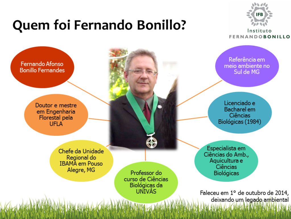 Fernando Afondo Bonillo Fernandes era uma das principais referências em meio ambiente no Sul de Minas Gerais. Fernando Bonillo era professor do curso de Ciências Biológicas da Universidade do Vale do Sapucaí (UNIVÁS), doutor em Engenharia Florestal pela Universidade Federal de Lavras (UFLA) e tinha especializações em Aquicultura, Ciências do Ambiente e Ciências com ênfase em Biologia. Por diversos anos, ele foi chefe da unidade regional do IBAMA, em Pouso Alegre – MG. Faleceu em outubro de 2014 e deixou como legado seguidores que sempre admiraram e respeitaram seu trabalho.